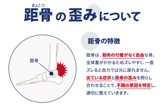親指が曲がってしてしまうのは結果であり、足首の真ん中にある「距骨」という骨が内側の捻じられて、不安定になり変位して形態異常を起こしているということです。