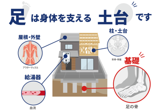 足は身体の土台です。土台である足がゆがんでいると、その上に存在するひざ・骨盤・腰・首の関節を歪ましてバランスを取るようになります。また、足元がグラついて不安定だと、筋肉を硬直させてバランスを取るようになり、コリや痛みの原因になります。
