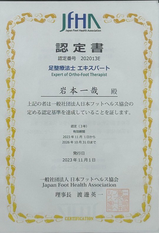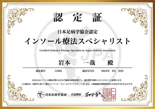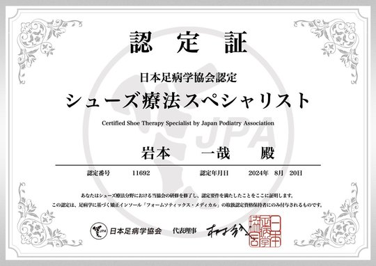 日本足病学協会 ・インソール療法スペシャリスト ・シューズ療法スペシャリスト