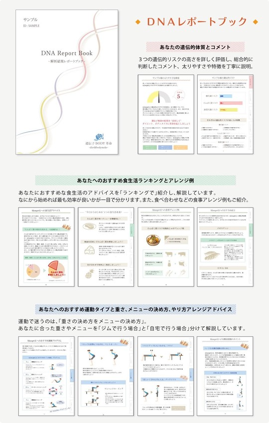 「糖代謝リスク」「たんぱく質リスク」「脂質代謝リスク」の3つの遺伝的な肥満リスクから太る原因と太らないライフスタイル、高い効果が期待できる ダイエット・ボディメイク法を導き出します。