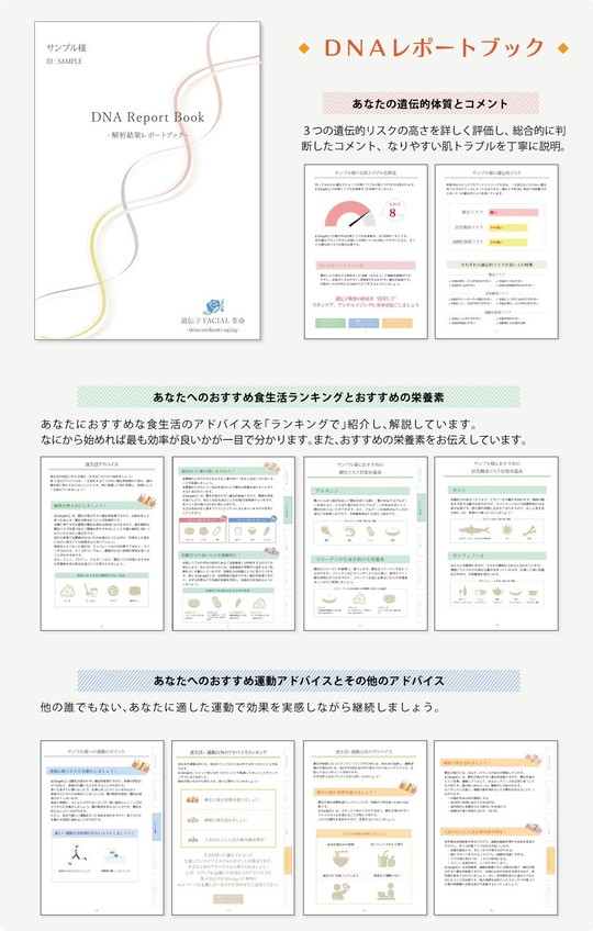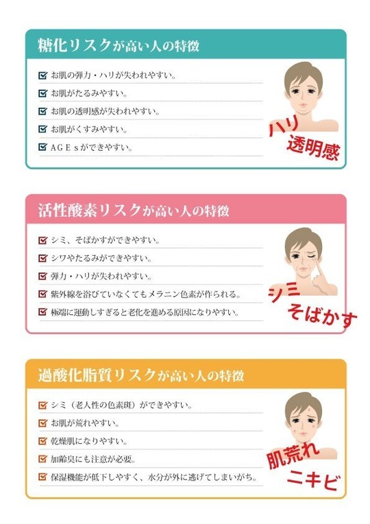 「糖化リスク」「活性酸素リスク」「過酸化脂質リスク」の3つの遺伝的な肌トラブル・アンチエイジングリスクからお肌のトラブルや老化を引き起こす原因や、防ぐための効果的な方法を導き出します。